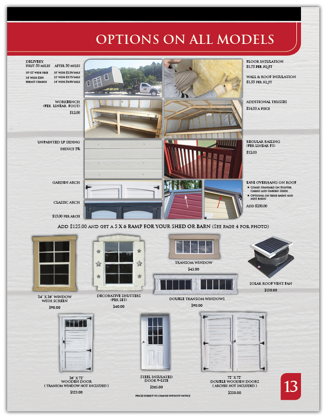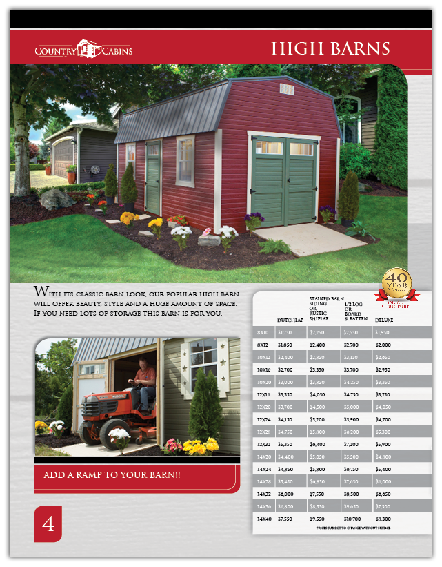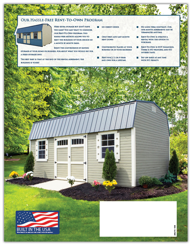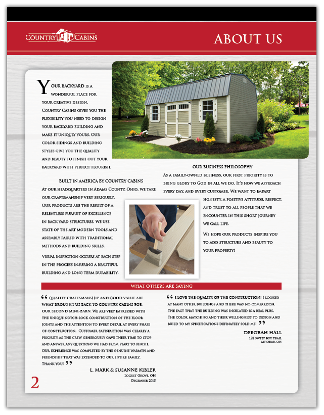 As a graphic designer for SolTerra Communications, I was able to help a local storage shed and cabin manufacturer grow their brand by utilizing my experience to help develop a logo and 12 page brochure that has grown their business tremendously! I used Adobe InDesign to lay everything out in the brochure and Adobe Photoshop to place most of the buildings into beautiful landscape photos.ABOUT