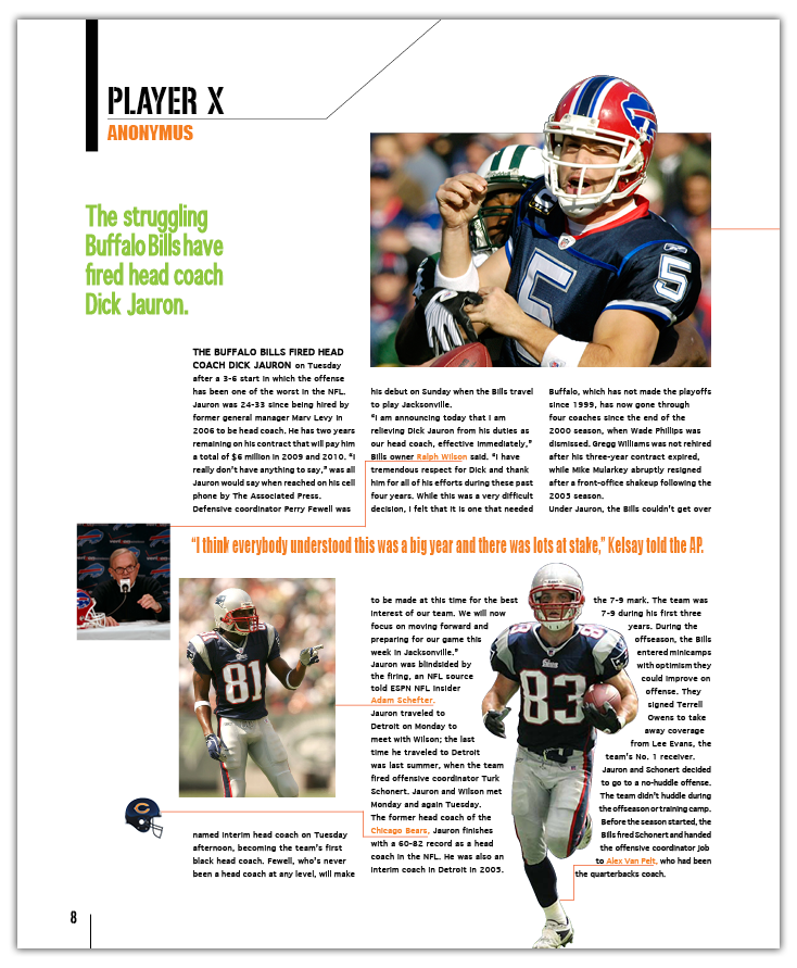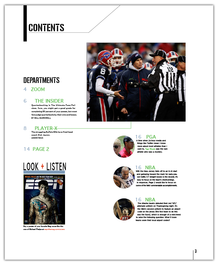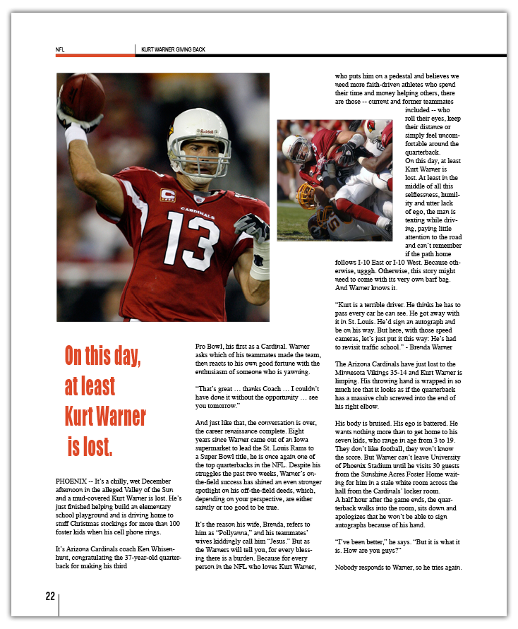 My college senior design project was a fictional 20 page edition of ESPN magazine. I stayed close to the magazine's traditional style practicing my layout and typography skills. The layout and design of this project was done with Adobe InDesign and Adobe Photoshop to cutout and manipulate photographs.ABOUT