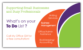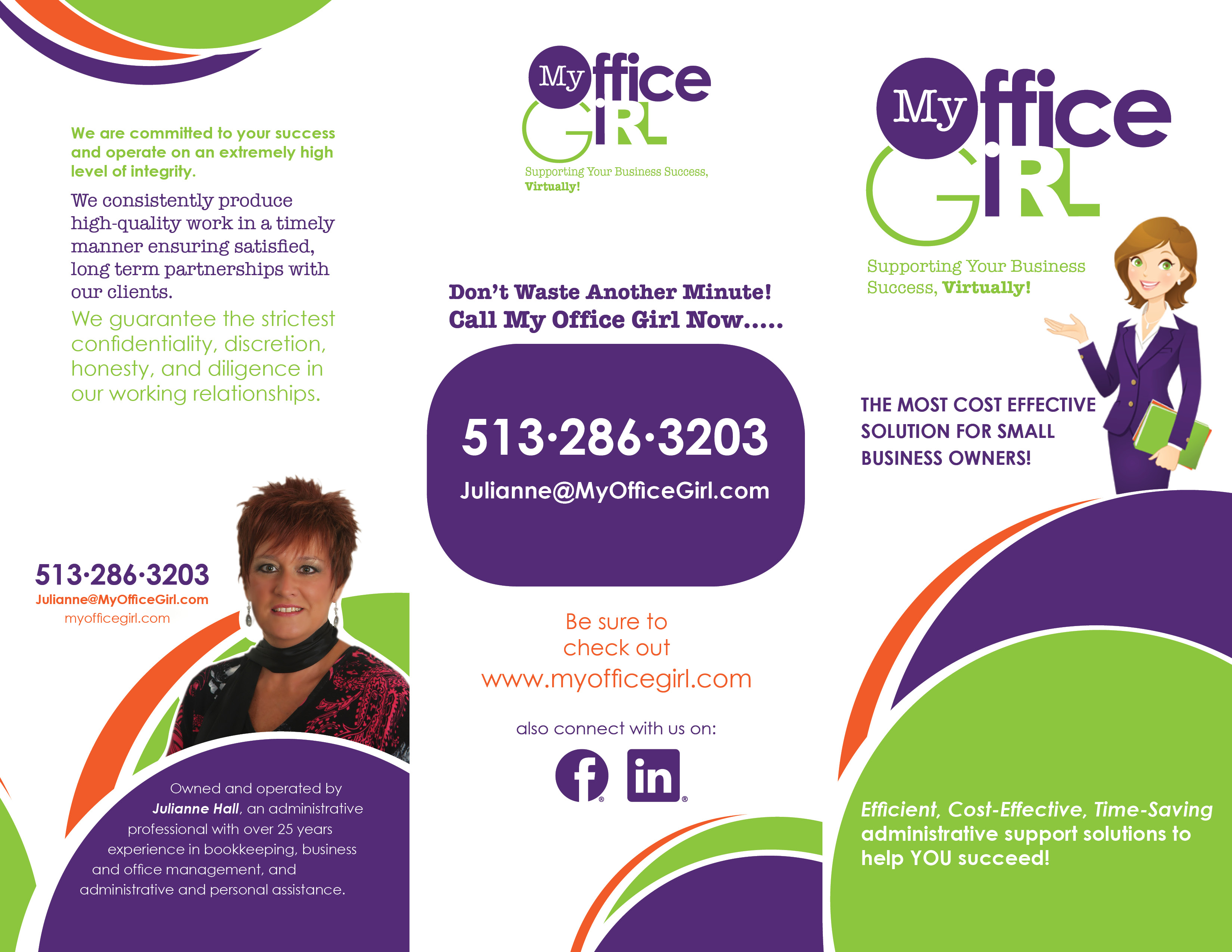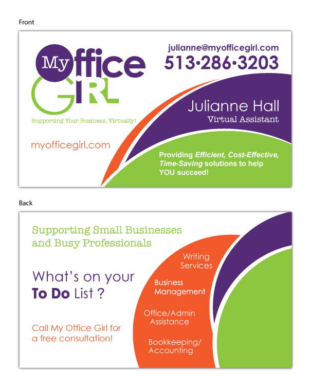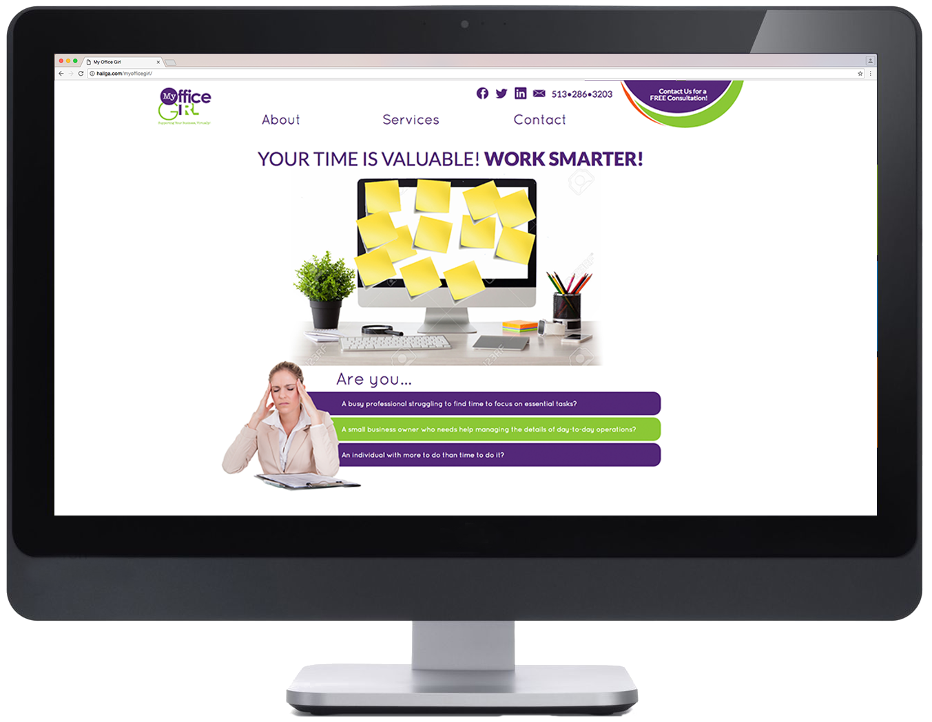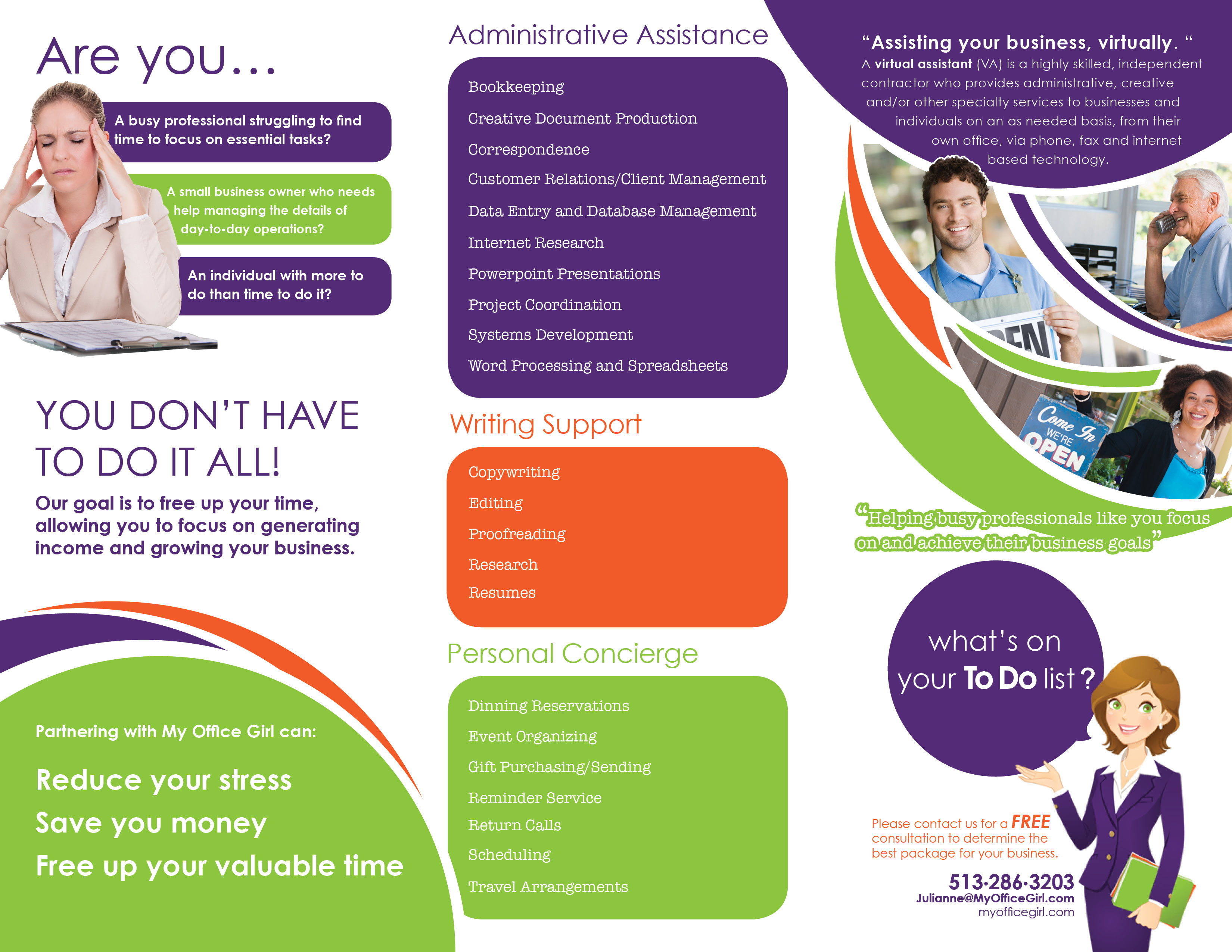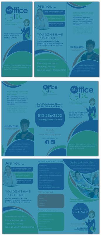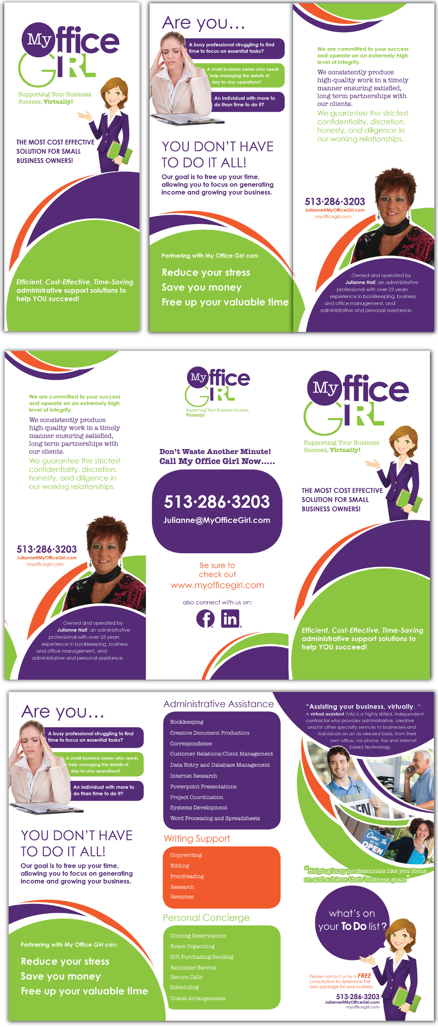 A logo for a virtual administrative assistant along with the displayed identity design throughout the brand from the printed material to the website.About